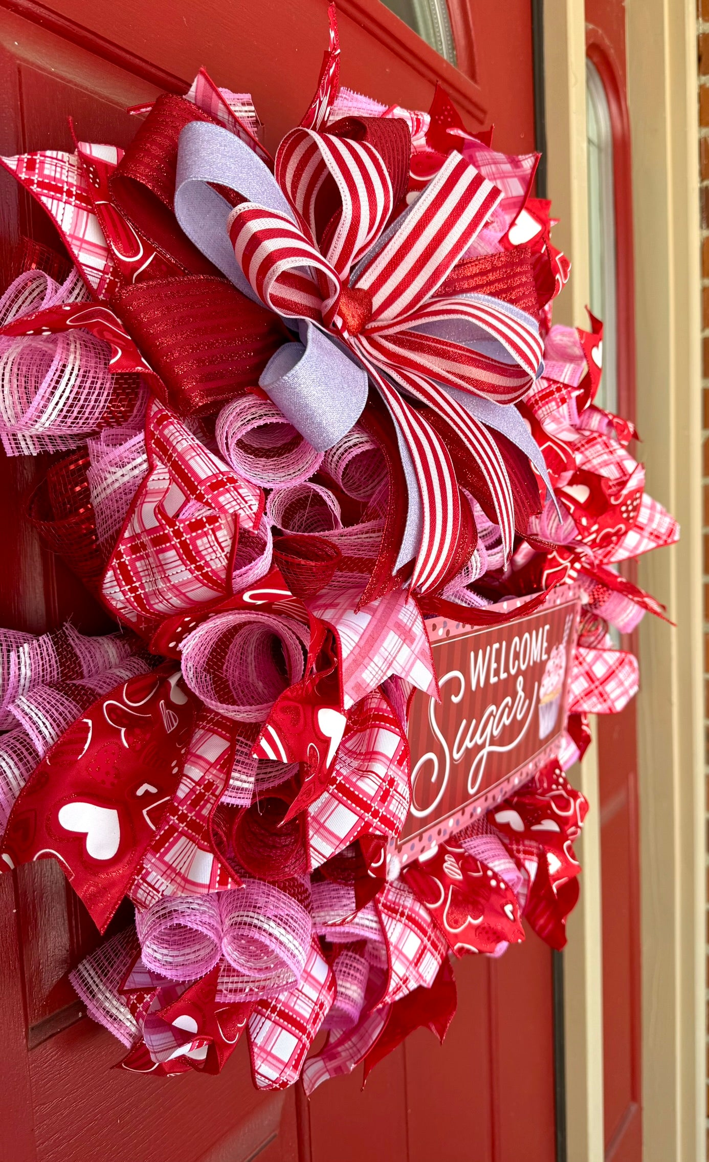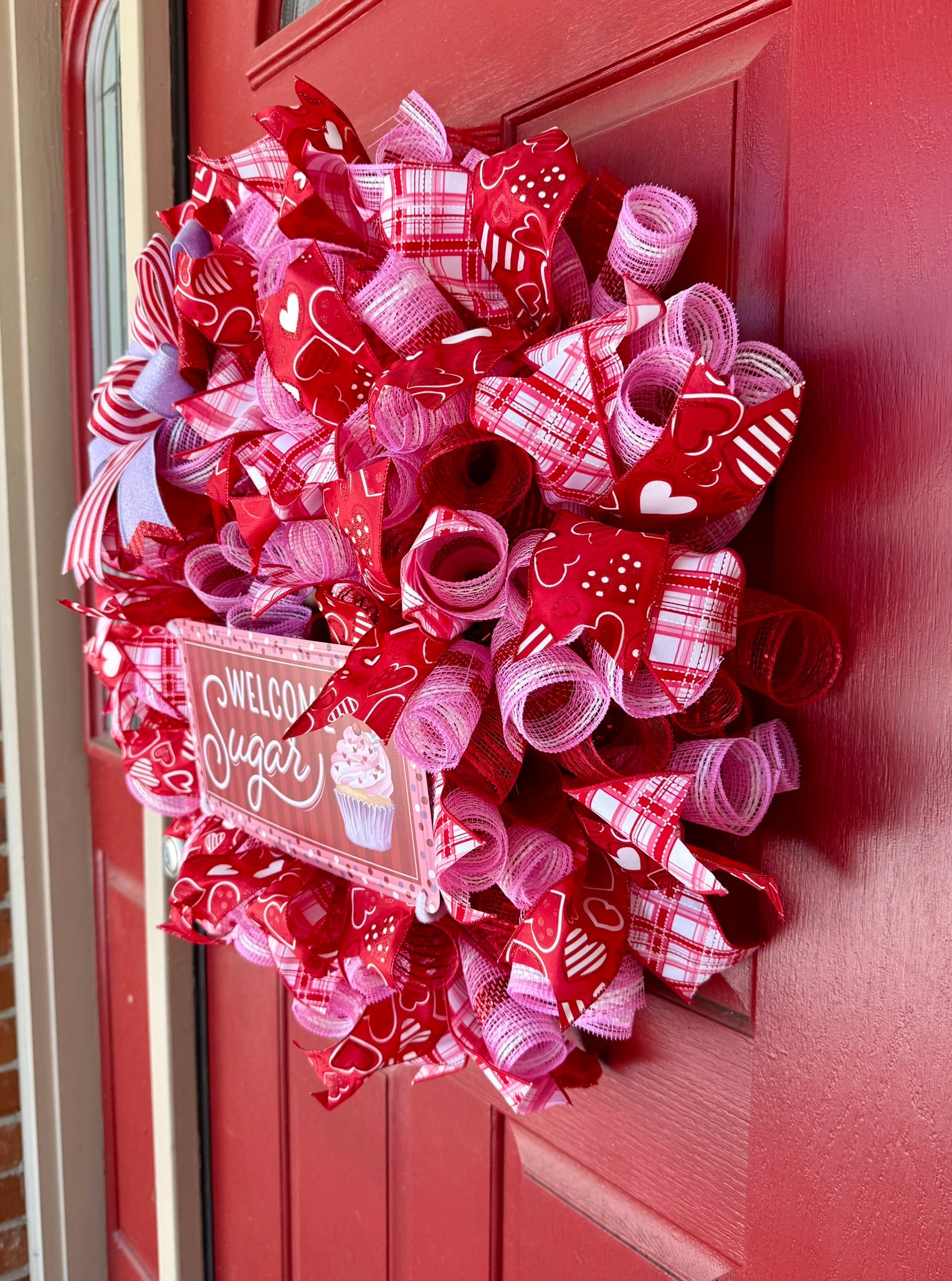 Welcome your guests with this charming Valentine's Day wreath! Handcrafted with mesh, stunning ribbon, and a metal sigh, it's the perfect way to dress up your front door for the season of love. This festive piece brings warmth and whimsy to your entryway, setting a sweet mood for everyone who visits. Whether you're celebrating with someone special or spreading joy throughout your home, this wreath adds that extra touch of Valentine's magic to your space.